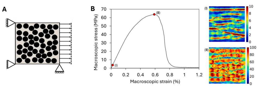 图 3 (A) 边界条件和施加荷载的示意图;(B) 加载条件下,样本微观结构的宏观应力-应变曲线。所选线性冯·米塞斯应力场 (I) 对应于 0.024% 的应变,而非线性冯·米塞斯应力场 (II) 对应于最大宏观应力。宏观应力是通过将微观结构左侧边缘节点的反力之和除以横截面积计算得出的。
