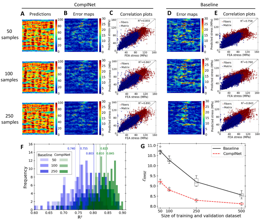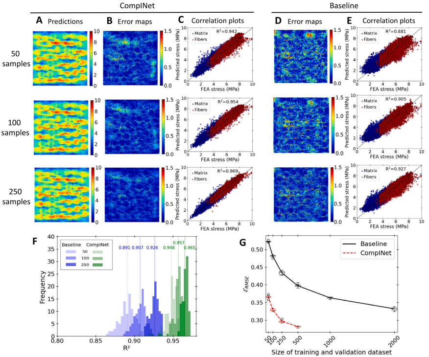 将 CompINet 的预测结果与基线模型 (U-Net) 进行了比较。结果表明,CompINet 在预测线性应力和非线性应力方面均优于基线模型,并且使用更少的训练数据即可达到更高的准确率。