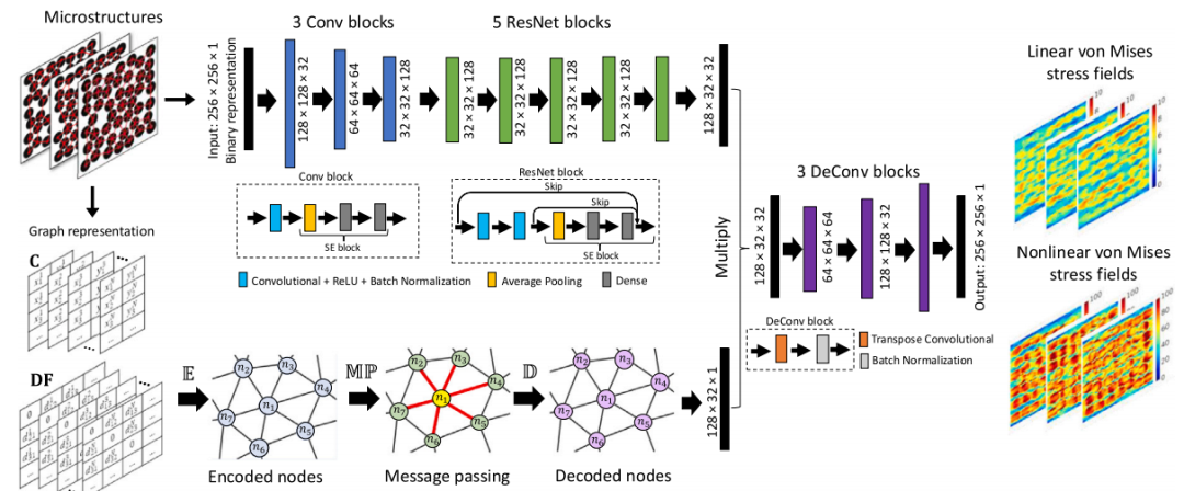 CompINet 框架结合了 CNN 和 GNN 的优势,能够更全面地捕捉复合材料微观结构的特征。CNN 用于处理复合材料微观结构的像素级表示,而 GNN 用于捕获纤维之间的相互作用和关系。