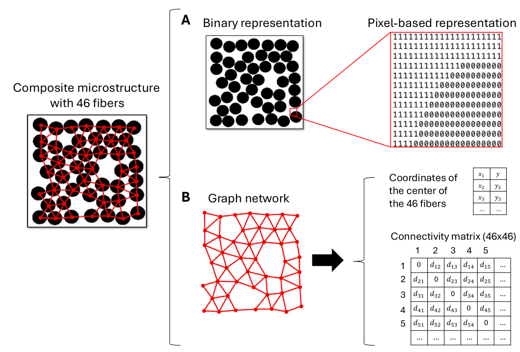 图 1 复合材料微观结构的两种表示方式:(A) 像素级二值图像;(B) 图网络。