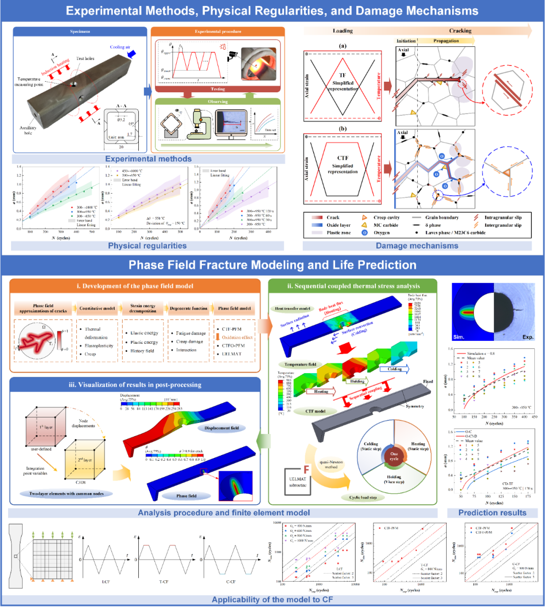 在实验研究方面,团队围绕实验方法、物理规律与损伤机理三个核心内容开展研究。首先,开发了适用于带孔薄壁结构的热循环实验方法,该方法结合高频感应加热与强制风冷技术实现精确热循环控制,并针对镍基高温合金材料特性设计了带测试孔的管状试样,通过对比不同孔型结构确定了设计方案。其次,以温度变程、平均温度及高温保持时间为控制变量开展实验研究,通过系统数据分析明确了各参数对裂纹扩展寿命的影响规律,并从经验角度阐释了其作用机理。最后,基于微观组织观测和元素分析结果,探究了裂纹形貌所反映的损伤特征,最终明确了热疲劳和蠕变-热疲劳两种疲劳行为的损伤机制。