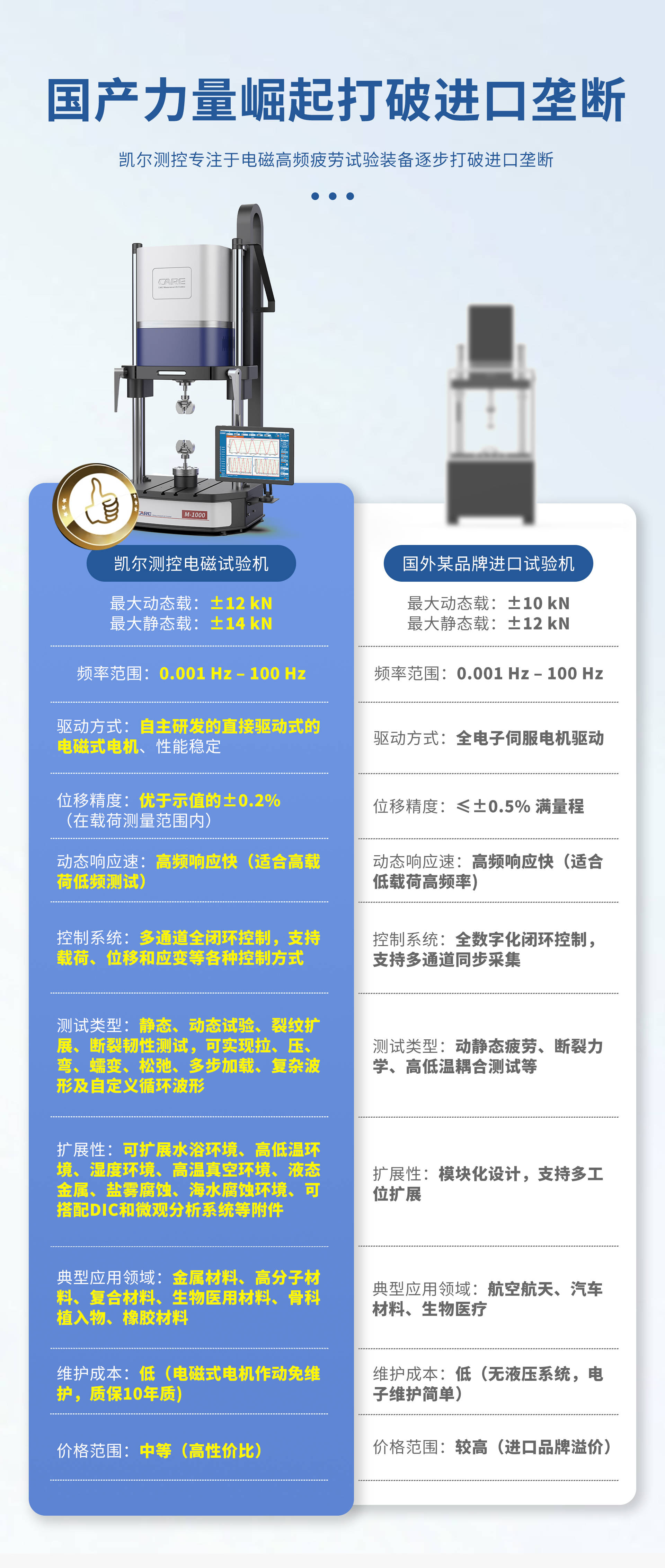1. 测试频率:工作频率通常在50Hz至300Hz,甚至可达1000Hz以上,比传统液压机(通常<100Hz)和伺服电机驱动(通常<100Hz)快一个数量级。这极大地缩短了测试时间,对于需要数百万甚至数亿次循环的耐久性测试(如汽车部件、航空航天材料)具有革命性意义。