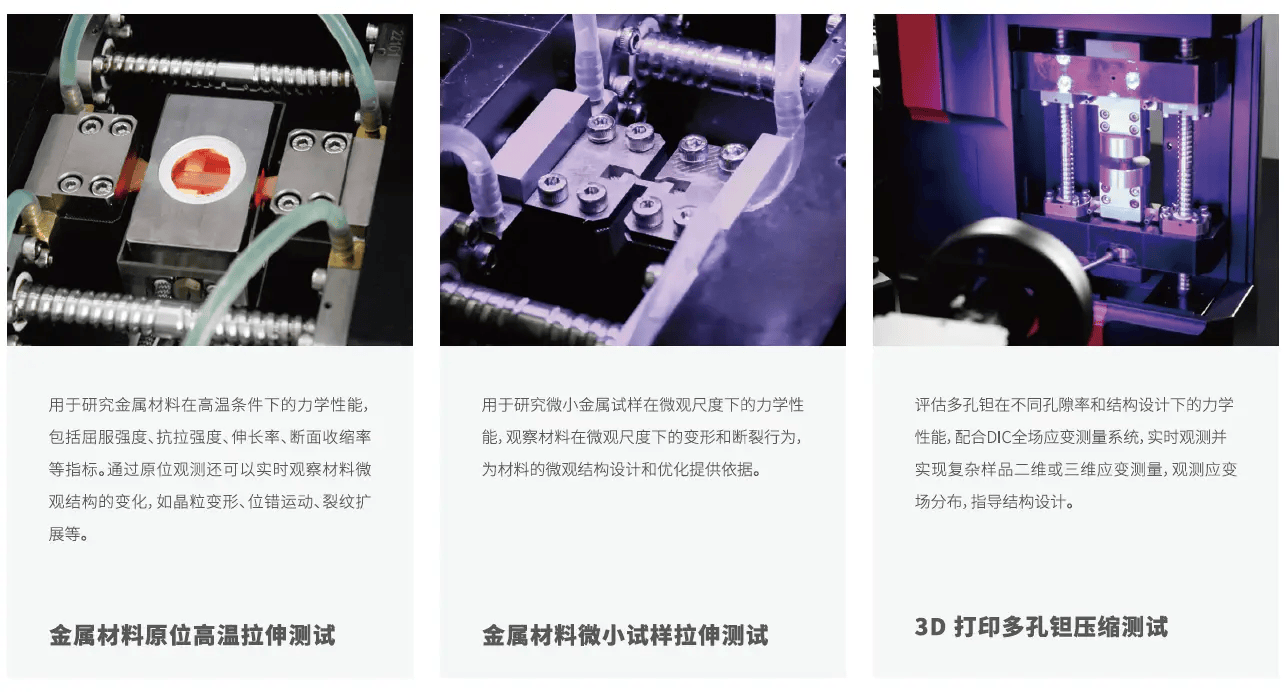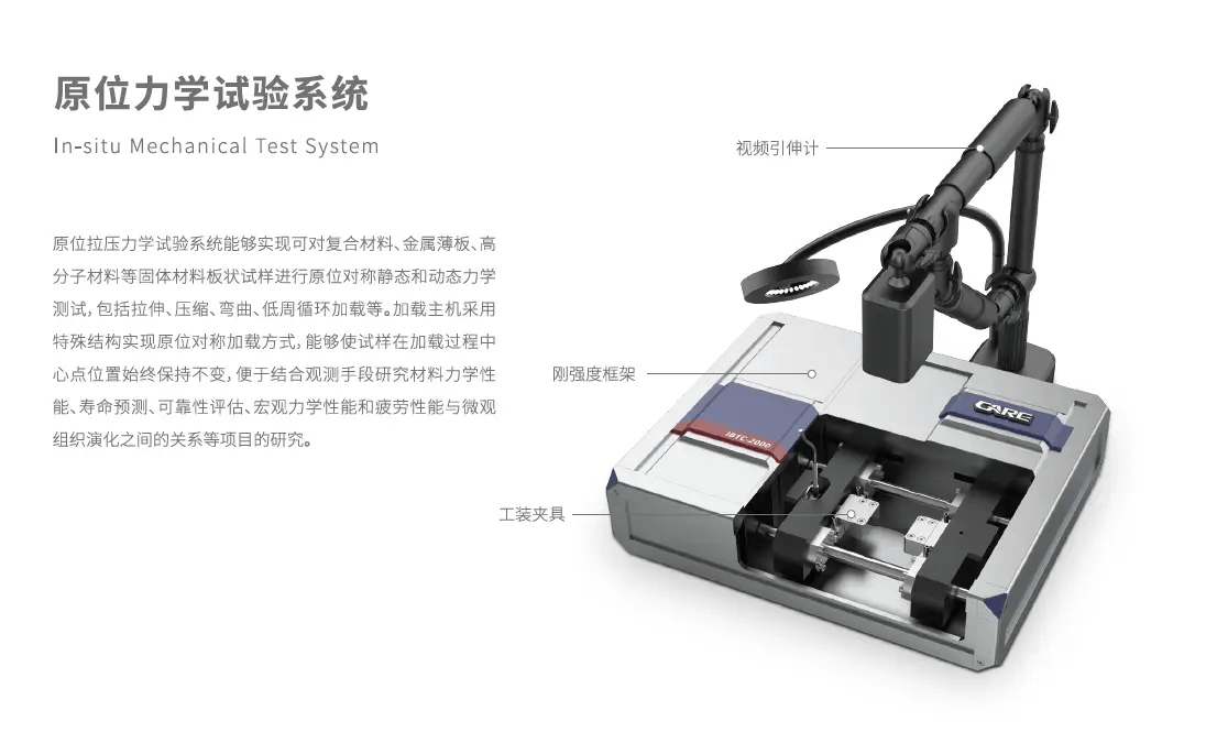 近年来,力学测试研究的一个显著趋势是 “看得见"的力学,即在测试材料力学性能的同时,能够通过显微镜等设备实时观察材料内部的微观结构变化。这种“原位"测试能力,对于揭示材料的变形与失效机理至关重要 。